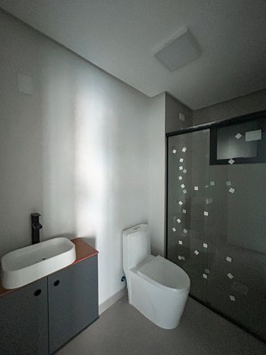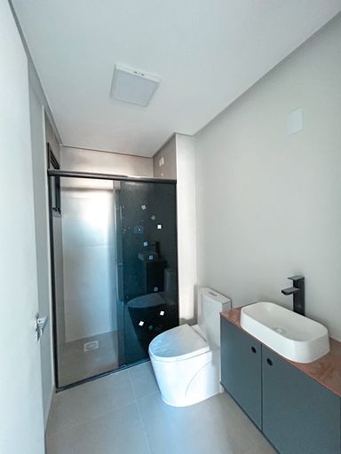 Banheiros montados com box de vidro, armário, vaso e chuveiro