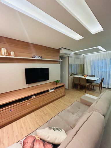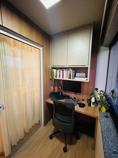 ▪️sacada já nivelada com a sala feito um home office com móveis sob medida